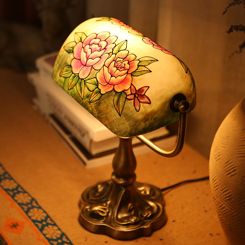 子兰台灯具有精减图案,清新复古,油画工艺,栩栩如生;采用玻璃彩绘灯罩,应用灯光把花朵的层次渲染出来;铜色铁艺灯杆,让你感觉每天都有新的猜想,好像总有说不完的故事;沉稳迎头赶上锌合金底座,有着超长的保质期,一直保留着原有的光泽;
