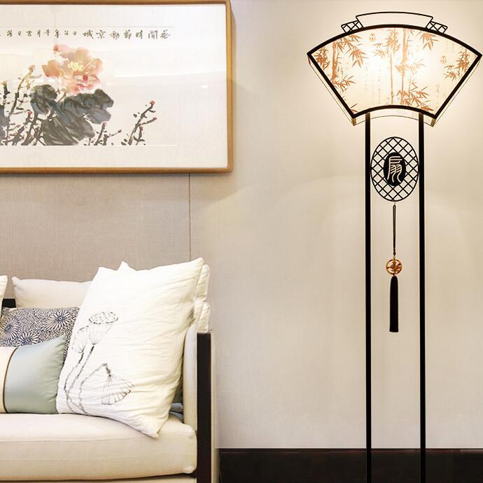 中国古代扇形设计,布艺灯罩上为竹子图案,无缝拼接灯体,烤黑漆底座,整体富有独特的东方元素。
