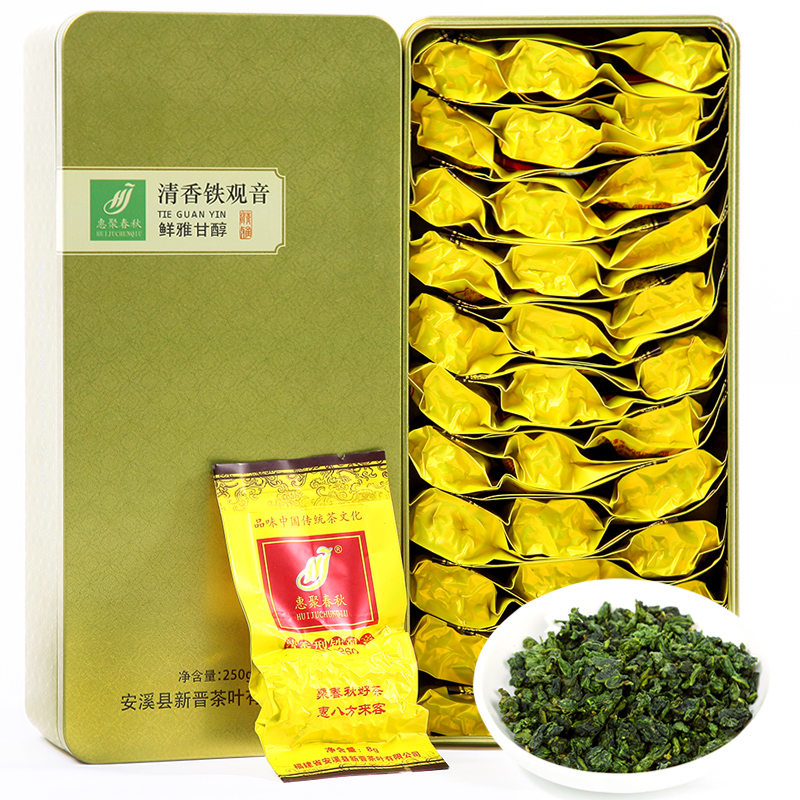 安溪铁观音,又称红心观音、红样观音,视为乌龙茶中的极品,干茶外形紧结沉重,色泽砂绿油润,天然的兰花香,馥郁持久,俗称“观音韵”;汤色金黄浓艳似琥珀,滋味醇厚甘鲜,饮之齿颊留香,回甘悠久,茶香高而持久,可谓“七泡有余香”,古人有铁观音“未尝甘露昧,先闻圣妙香”之妙说。细啜一口,舌根轻转,可感茶汤醇厚甘鲜;缓慢下咽,回甘带蜜,韵味无穷。对于别的茶来说,春茶当然最好,而铁观音恰恰相反,以秋茶为最好,春茶次之。秋茶的香气特高,俗称“秋香”。
