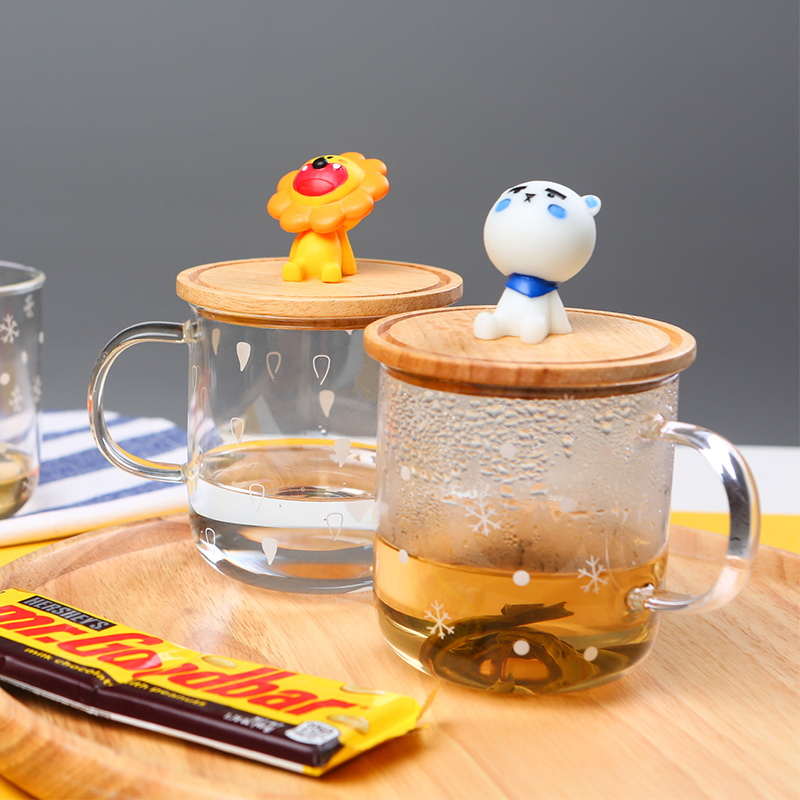 一个简单的玻璃水杯,盖子的设计很特别上面坐着十二星座造型的卡通人物,杯子有保温效果很实用。