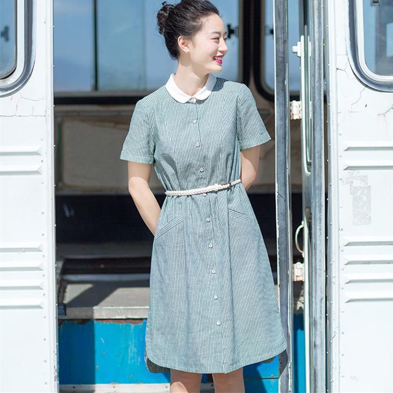很清新的条纹连衣裙,采用经典的翻领,短袖设计,左胸前蝴蝶结刺绣点缀着衣服,使其看起来更加的有美感,收腰的款式a字版型,对体型有优化的效果,显瘦效果比较好,棉质的面料上身舒适透气,穿着凉快。
