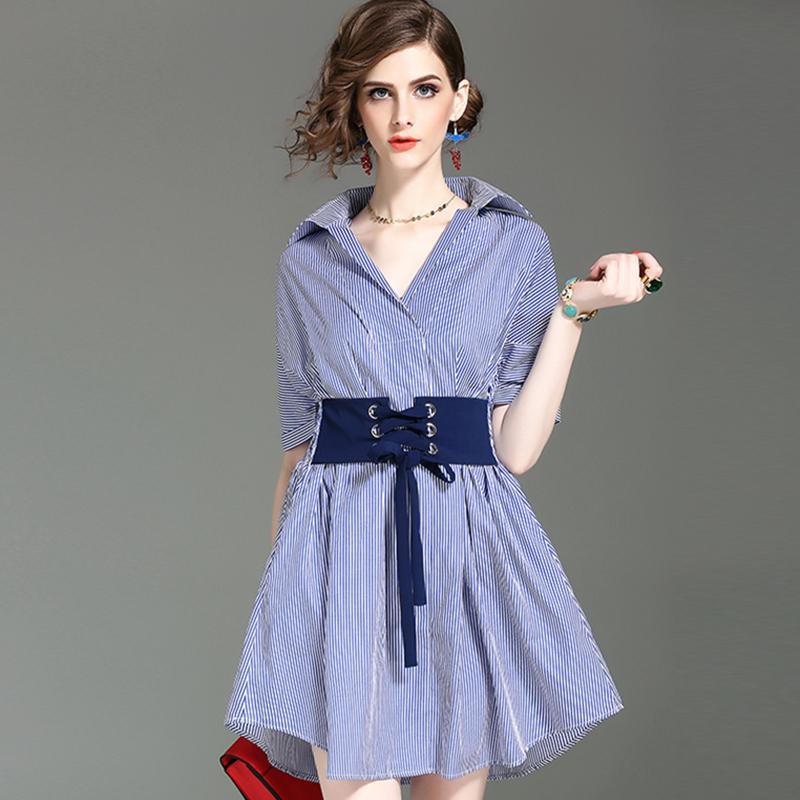 应该说这款衬衫连衣裙很有女人味,采用V领的设计,袖子采用的是喇叭袖,对胳膊有修饰的效果,腰间系带的设计,既别致又能凸显腰线,竖条纹加上蓬蓬的裙摆显瘦效果非常好。
