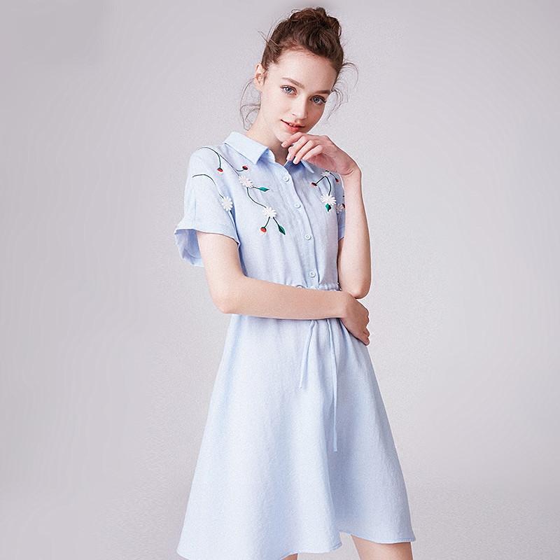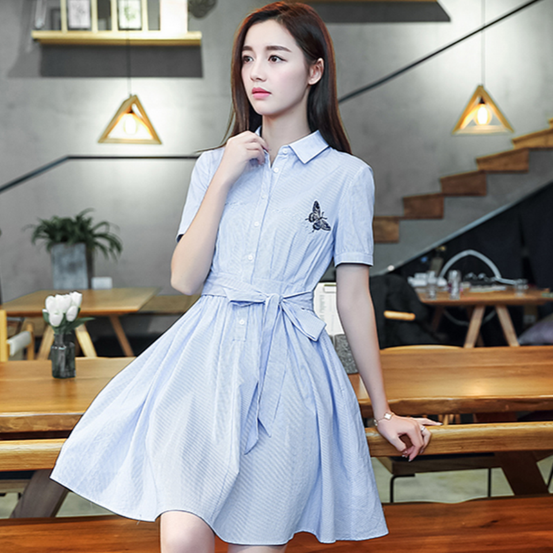 很清新的条纹连衣裙,采用衬衫式的版型,刺绣的设计栩栩如生非常美观,采用短袖的设计,收腰的款式,这样清新的连衣裙在平常穿可以穿一双小白鞋,轻松而又随意,而且很有学院风。