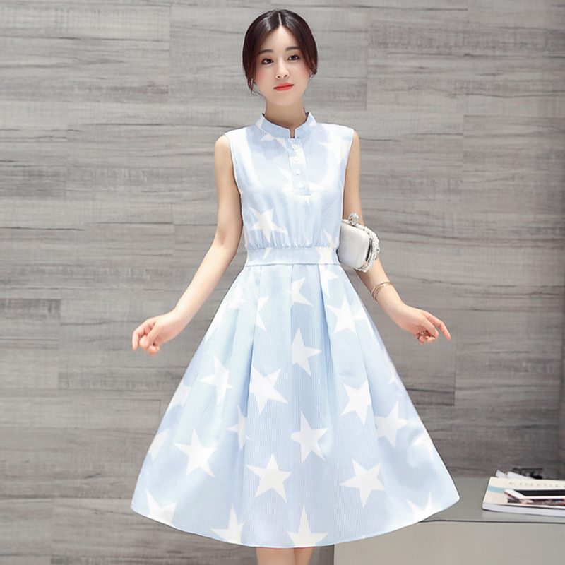 很清新的衬衫式连衣裙采用的是无袖的设计,小立领增加了其干练的效果,收腰的款式,蓬松的下摆,穿上去像小女人一样的妩媚,蓝色加上五角星的印花,休闲雅致,上身效果很赞。