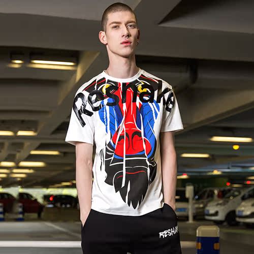 此款T恤设计独到之处就是夸张图案和明快的撞色色彩相融合,不管在任何时候总能让人瞩目,那男性的狂野和潮流结合,赋予了浓厚的街头风格,穿上它,男性荷尔蒙散发,酷酷的!