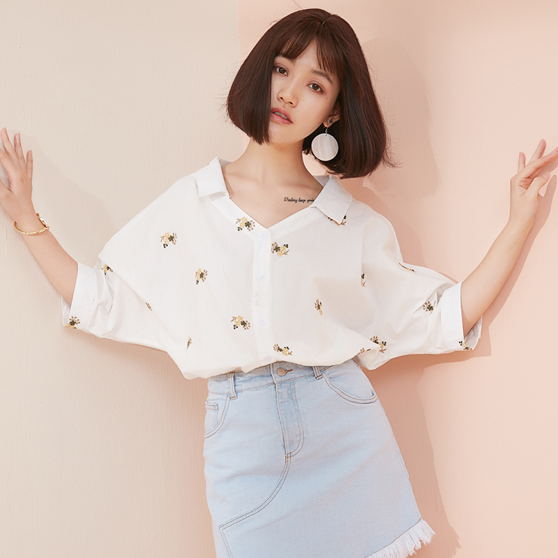 V领的设计,可以展示你完美的锁骨哦。配上五分袖的袖口设计也是一道靓丽的风景,再加上精致的刺绣,给你一种清纯,活力的感觉,所以