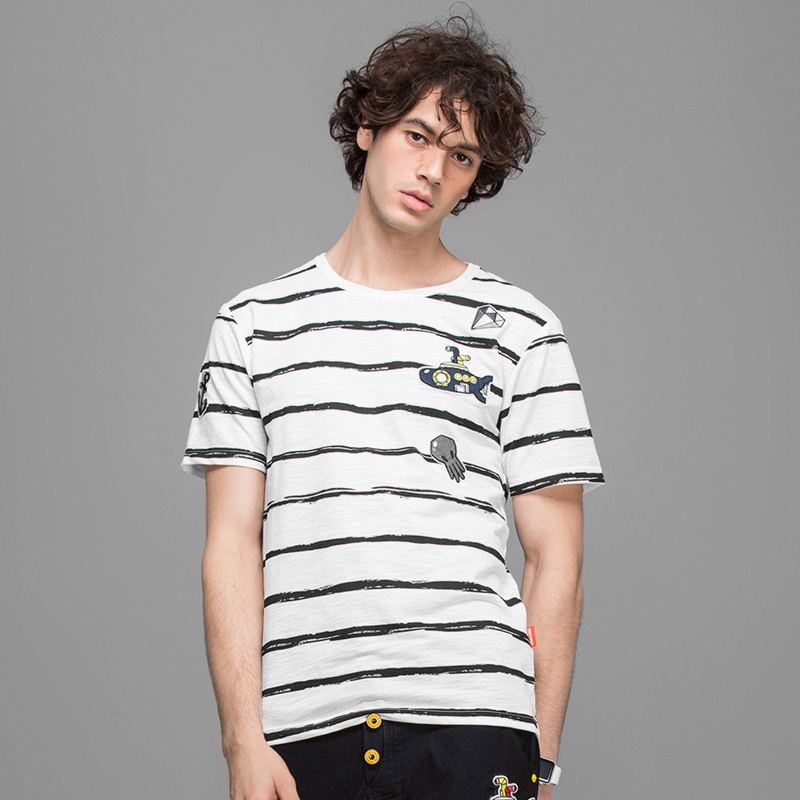 横条纹的T恤如何显得青春时尚,这款T恤足以满足,立体的剪裁简约又不失时尚气质,胸前简单的印花图案在横条纹中又显得帅气洒脱,尽显男孩青春气质,穿上它帅气一夏!