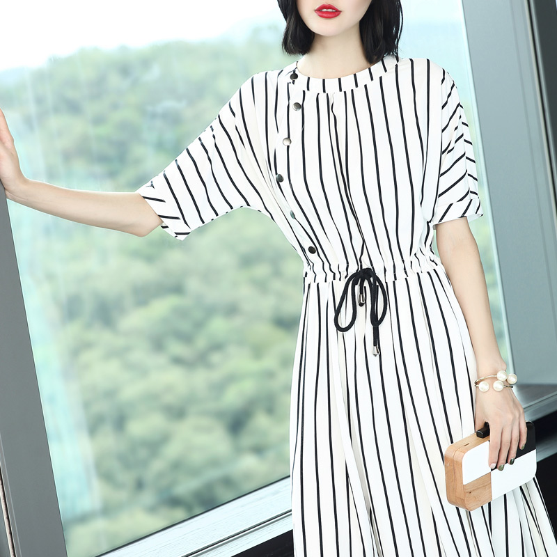针织的布料,穿着舒适,在炙热的阳光下有效的减少热量,修身的款式,勾勒出完美的身材曲线,楚楚动人,黑白条纹的设计,街头范儿十足。