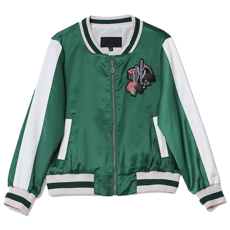 不知什么时候起墨绿色开始火热起来,用在夹克上十分洋气。衣领袖口处不放过经典的棒球条纹衫精髓设计,跃于视觉中,校园复古意味渐浓。精致的沙漠绿洲刺绣更显独特,让你出街不撞衫。