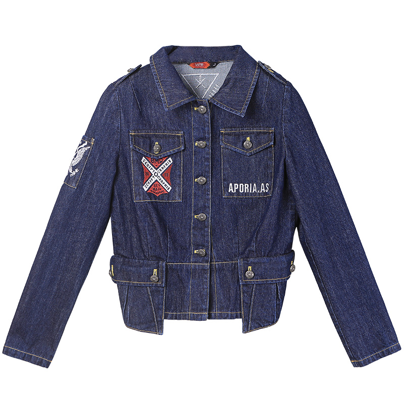牛仔硬朗的面料带有率性爽朗的气质,原色未经水洗的加工散发浓郁复古风,图腾徽章融入了英文和传统的刺绣工艺更具有现代实用性。后背下摆处精心设计的打褶处理满足菇凉们穿衣显瘦的爱美需求。