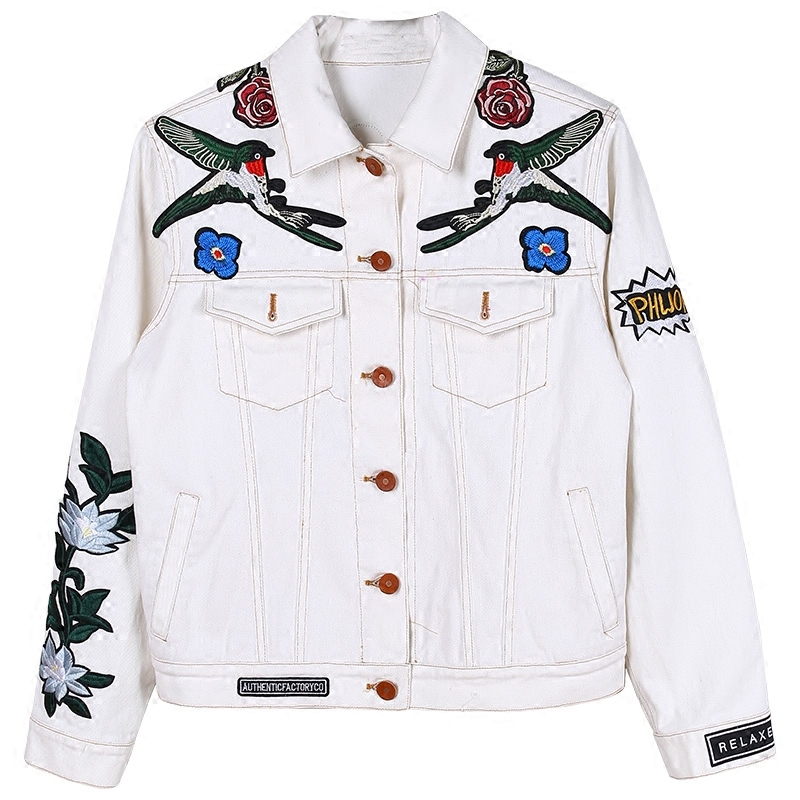 清爽的白色牛仔如同白底的绣花布,在上面刺绣出明艳动人的花来,带给你趣味新鲜的感受。迎合潮流还在上面加入了时下流行的章仔元素,使得衣服更具现代美式街头风。