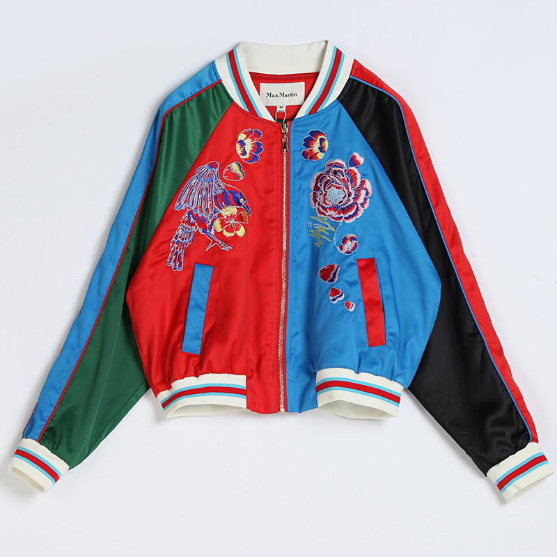 初秋的时候略有凉风却还不算太冷的天气里,正适合穿这件红蓝撞色的薄款缎面刺绣的夹克,透气轻盈时尚又吸睛。细致的刺绣和锁边技艺配合爽滑的手感,流露出高贵品质。