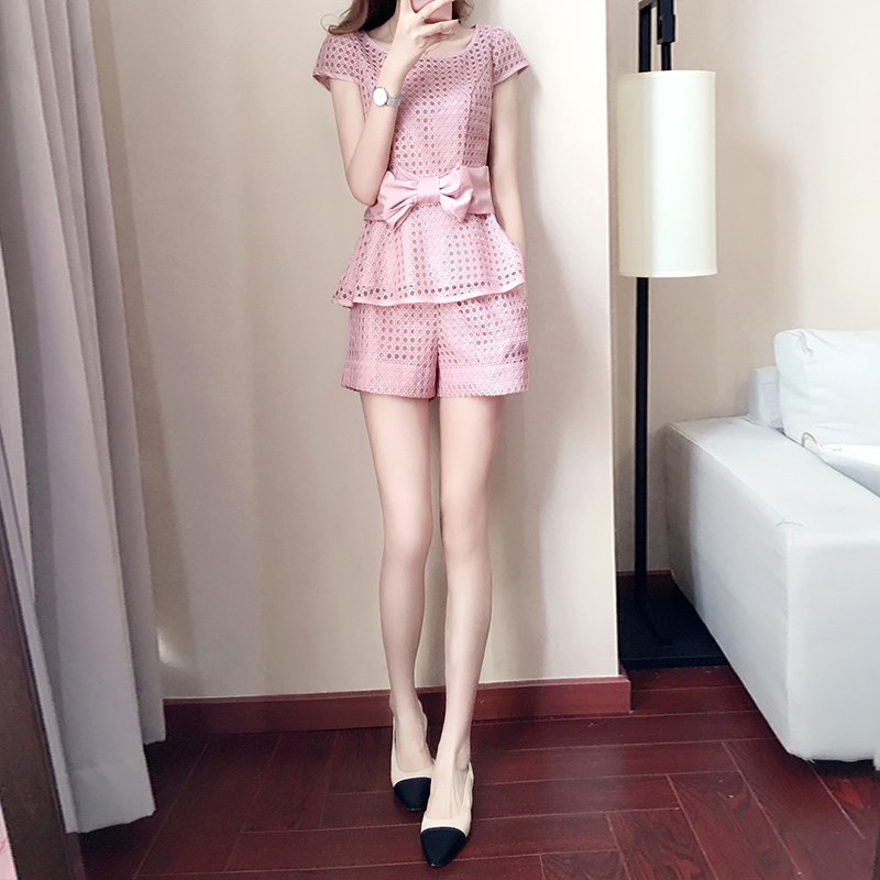 套装整体都采用了蕾丝镂空的花纹,但是加上里衬就避免了走光的尴尬。腰间大大的蝴蝶结装饰看起来十分有质感,而且也能遮挡肚子上的肉肉。