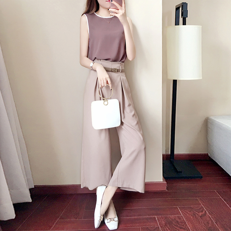圆领的背心上衣简约风十足,搭配一条雪纺的阔腿裤,不仅整体身材比例有所提升而且也很显瘦。再随意搭配一条腰带,气质满满。