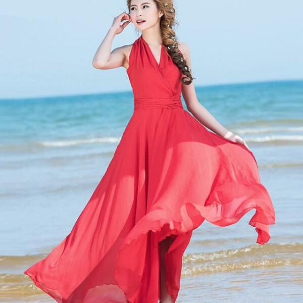 薄而不透的性感V领设计,凸显颈部曲线。展现女人的优雅。背部的设计是亮点,修身性感,妩媚动人,胳膊更显纤细。垂顺透气的雪纺,大红色的设计,飘逸的裙摆,让你感受夏日的浪漫、自由。