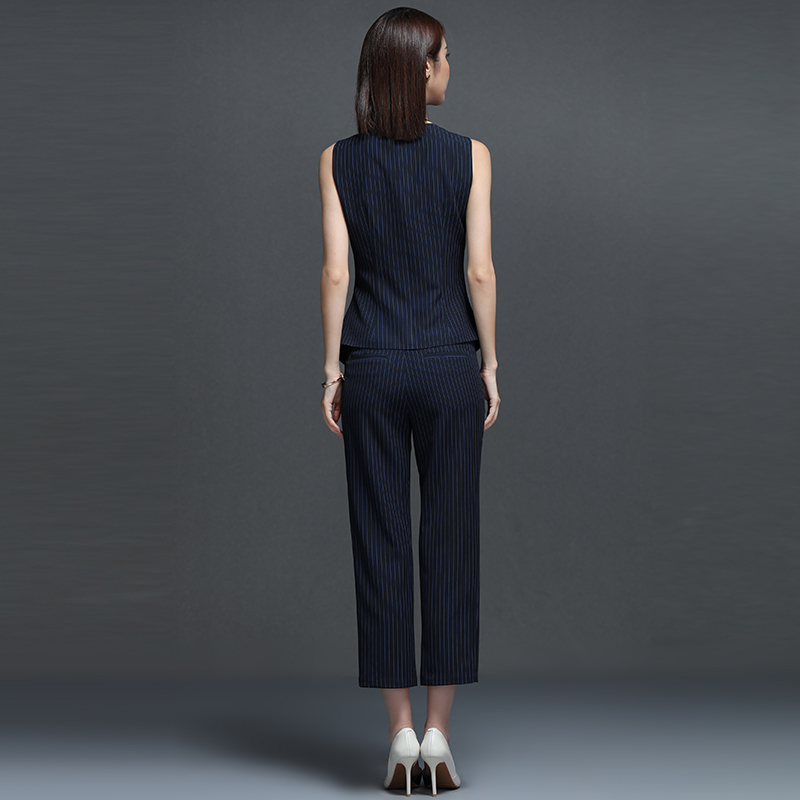 充满职场OL气质的条纹套装,品质的面料,细致的裁剪工艺,完美的做工彰显出每个细节的美感,简约干练的套装,穿出职场的魅影,优雅干练,女人味十足。在高腰和竖条纹的衬托下搭配一双高跟鞋尽显高挑的身材,而且整体显得时髦感十足。