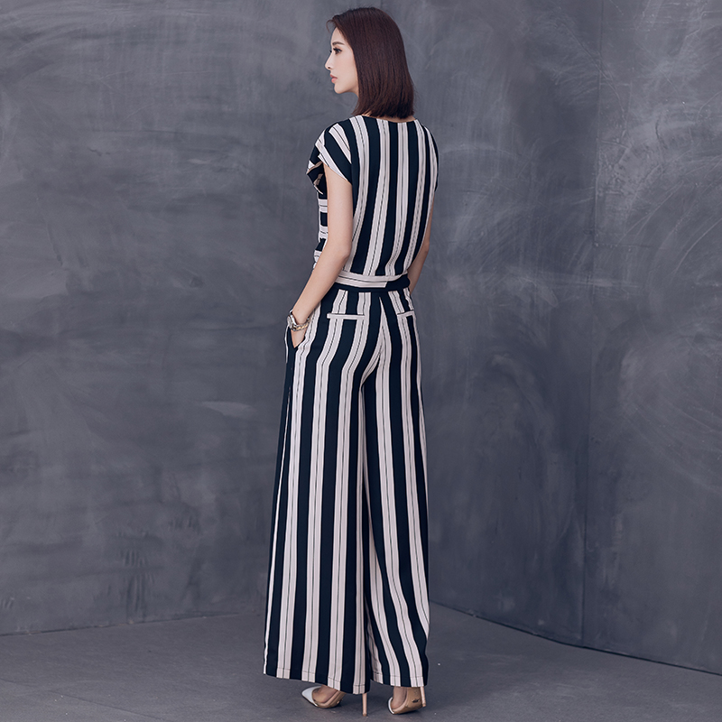 5. 罗衣原创2017夏装新款系带上衣+阔腿裤两件套修身条纹OL套装