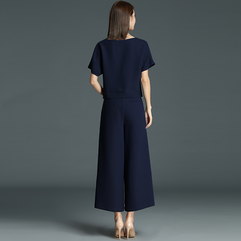 2. 罗衣原创新款简约圆领上衣+九分裤阔腿裤蓝色两件套套装
