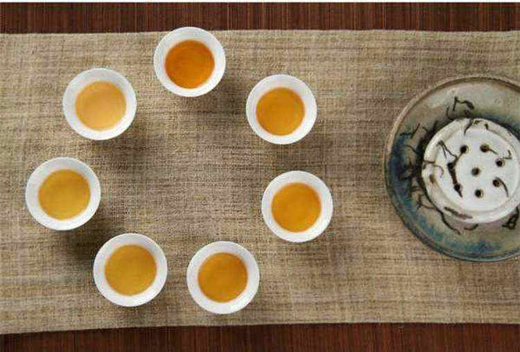 干茶紧结匀整,色泽铁青带褐,较油润。有天然花香,香不强烈,细而含蓄,味醇厚甘爽,喉韵明显,汤色橙黄清明。叶底红亮多嫩茎。