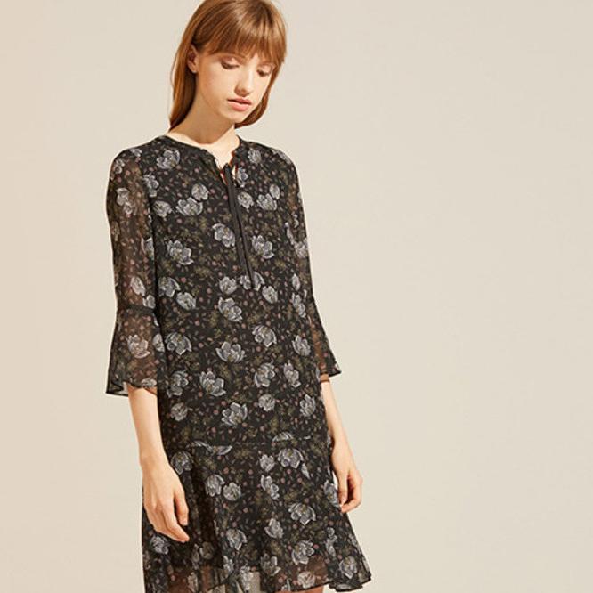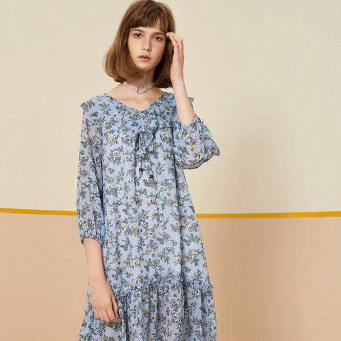 小小的碎花印在清透盈的雪纺上,独特的面料印花仿佛蒙上一层神秘的面纱,带着一股朦胧的梦幻美。