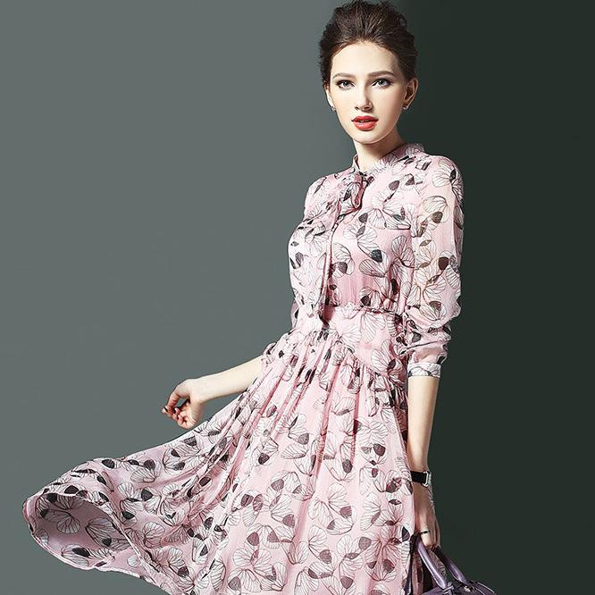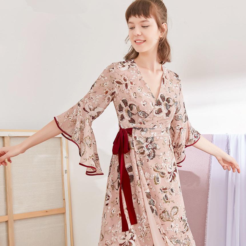 V领喇叭袖粉色气质雪纺碎花连衣裙,一眼看过去集性感妩媚与俏皮可爱于一身的法式柔情小女人味。