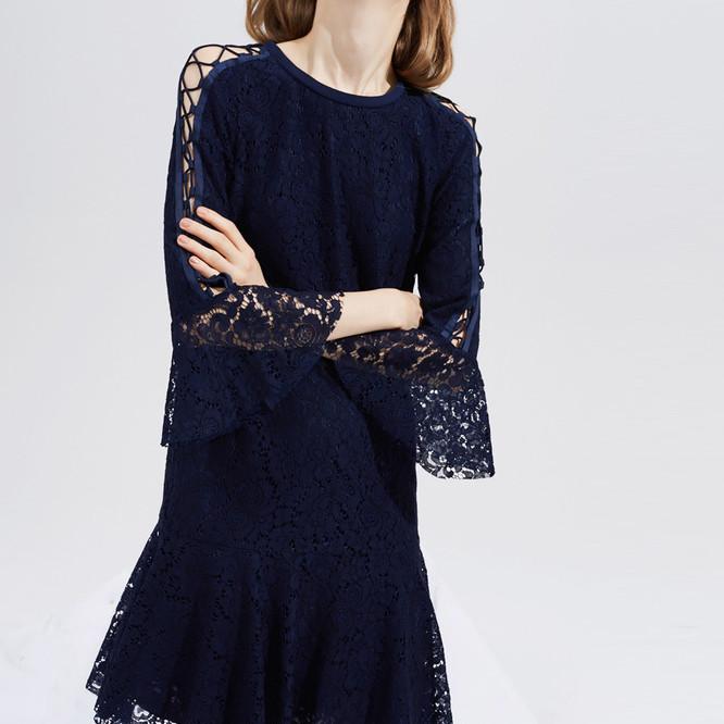 肩膀的绑带设计非常特别,交叉的渔网纹延续下是镂空的蕾丝印花,少些轻浮多些高贵的性感魅力,与拼接的裙摆将沉稳的深蓝色散发出迷人的色彩。