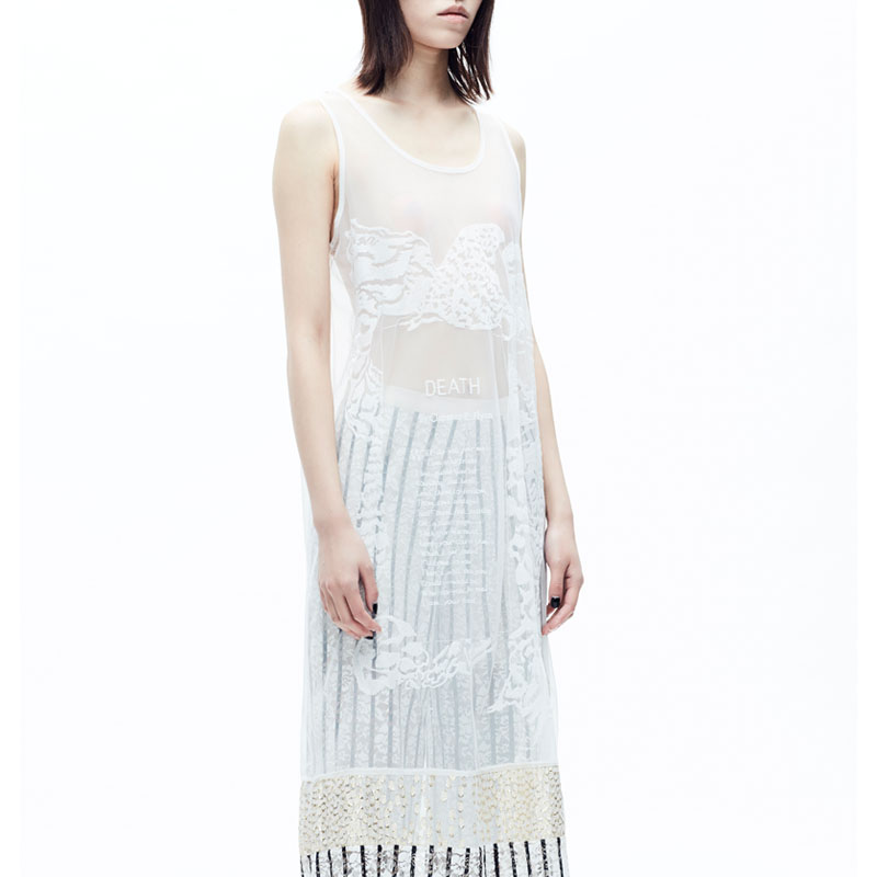 如果说黑色的半透明呈现的是一种神秘与野性,那换成白色则变成了干净与纯良。半透明设计的视觉冲击力不必言明,无袖款式更显大气简洁。