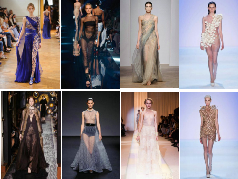 柏林时装周 Irene Luft秀场出现PVC透明材质上衣,不仅如此,巴黎高定时装周的各个秀场基本都有透视、透明、中空露胸的例子。时装周秀场裸露并不少见,但是要露出美感和层次,却是一门高深的学问。