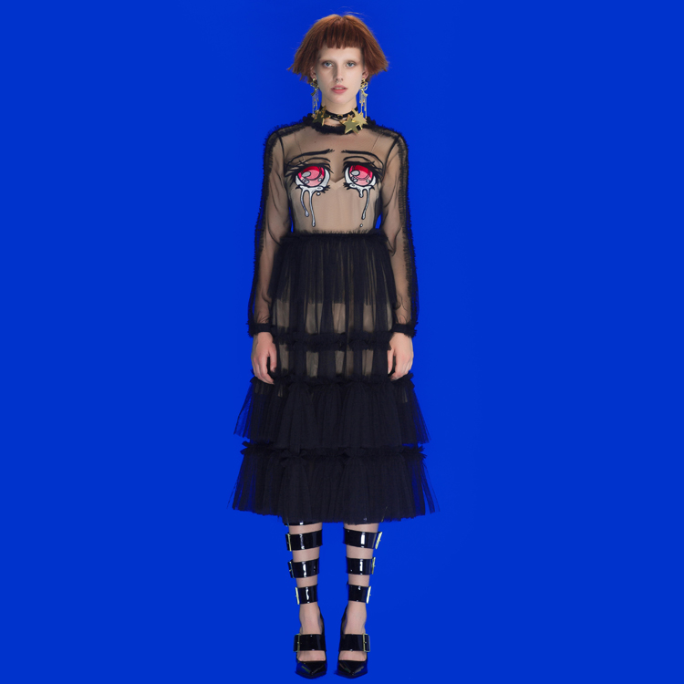 纱质及拼接设计跳脱而富有动感,魔鬼印花图案在向外界昭示,你是心里住着小恶魔的小仙女,神秘十足、具有破坏力,却依然纯真动人。