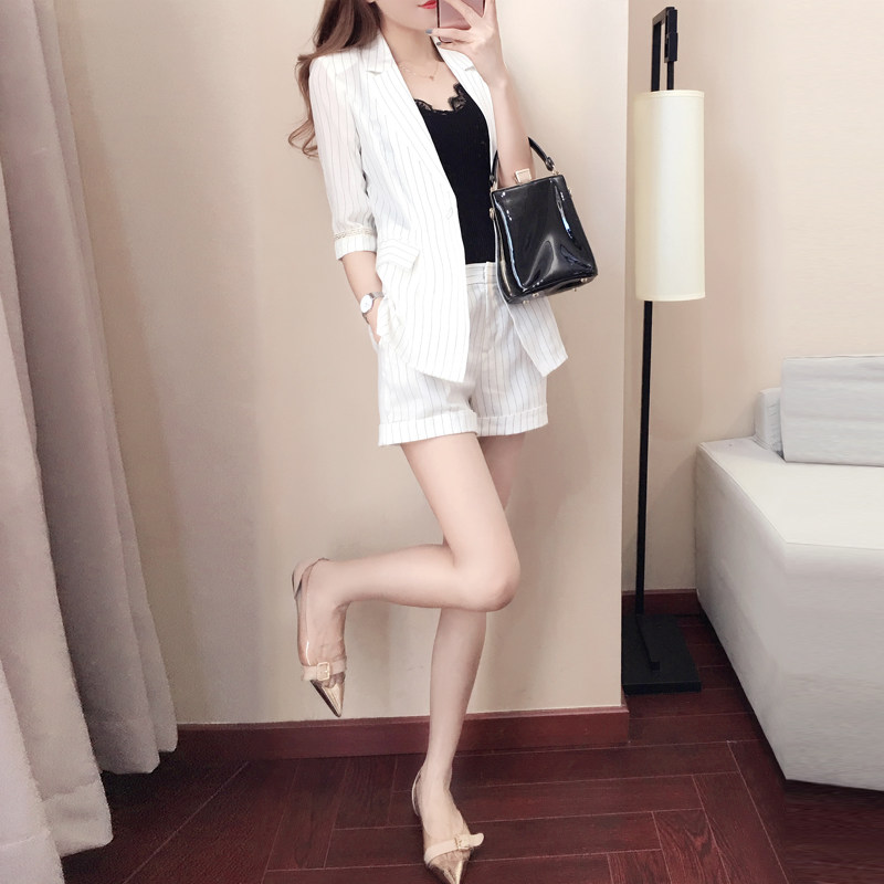 西装和短裤的组合,经典的竖向条纹视觉上拉长身材比例,款式的设计让人看起来不仅有气质而且还很大方优雅。上身会有一种名媛的即视感哟。