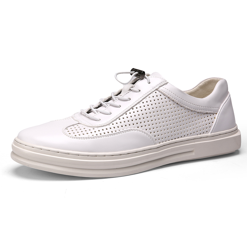 时尚休闲小白鞋会给人感觉看到它很清爽、纯洁、干净;就因有此因素,它就能受到型男们的青睐。青睐它本质的纯霞。它搭配一条九分破洞牛仔裤或者休闲裤都会让人感觉它具有亲和性;由于它有较强的亲和力不是每种款型都能达到此种效果!这款小白鞋就能体现它这方面的价值。这款是平跟款样,不会崴脚;鞋底用到的是耐磨橡胶材质,不会引起鞋底滑;真皮的材质工艺为压花皮,具有透气功能;流行元素为镂空式;它归属于型男范畴,作为一名优秀的型男范,你的脚上应该拥有它。