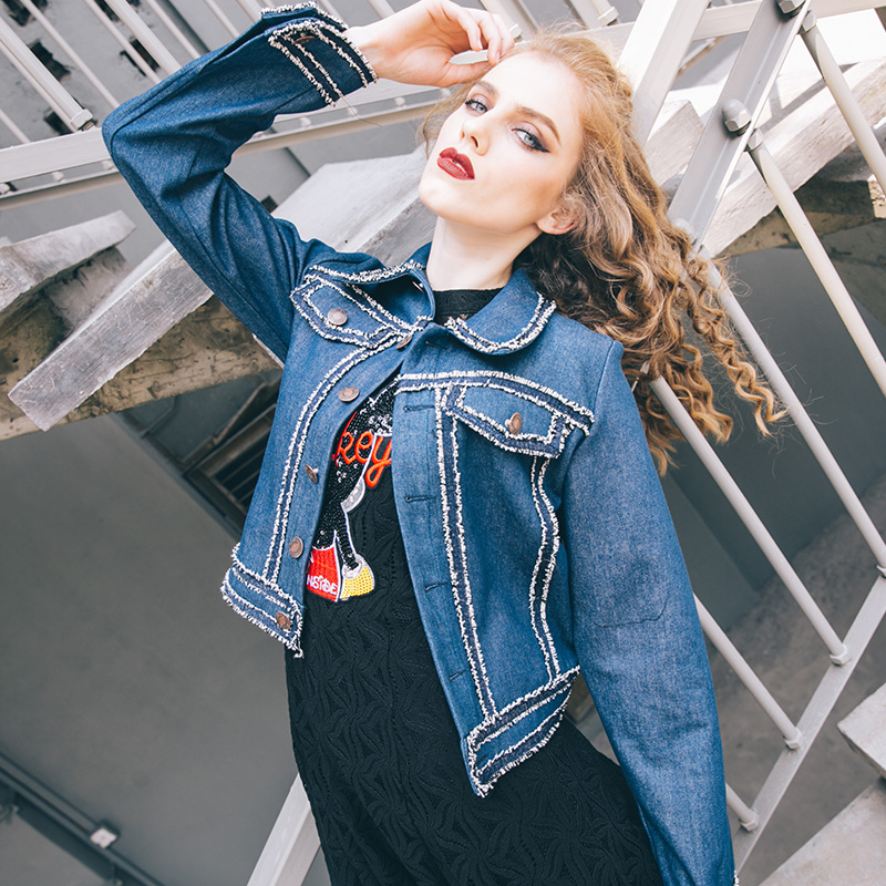 短款的牛仔外套多了份干练与洒脱,简单的翻领样式结合宽松版型,浅蓝色牛仔面料清新雅致。时尚的毛边点缀时髦个性。