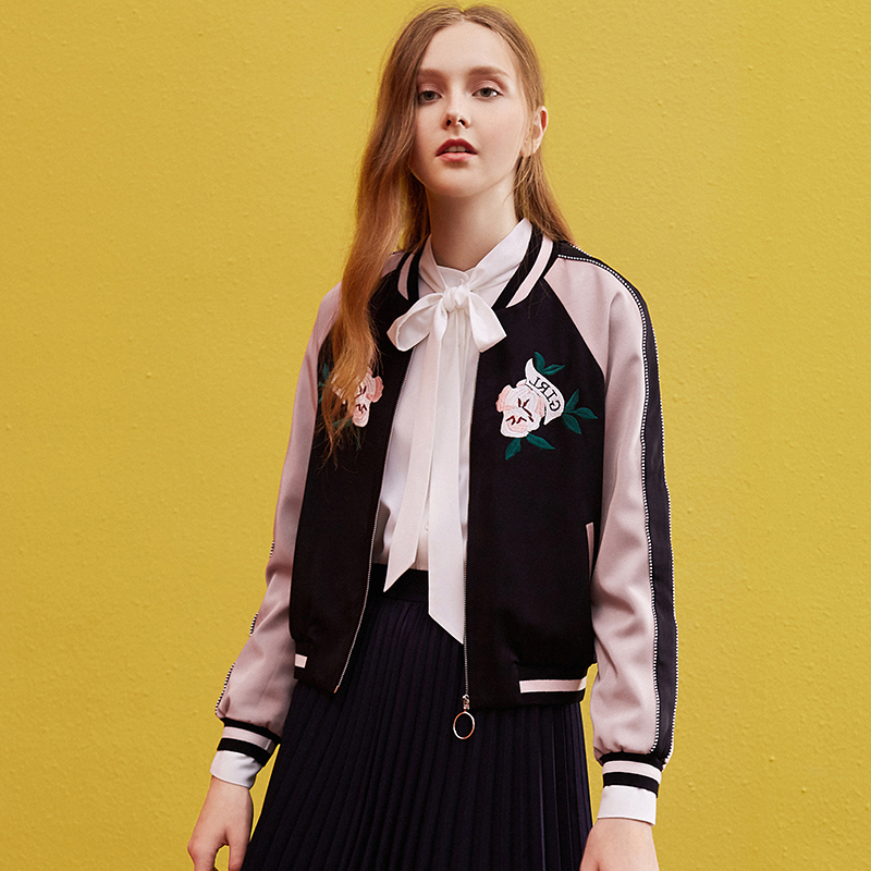 超有质感的垂顺面料,手感舒适顺滑上身效果极佳,螺纹立领撞色设计青春时尚,插肩袖搭配胸前刺绣花朵点缀,甜美清新。
