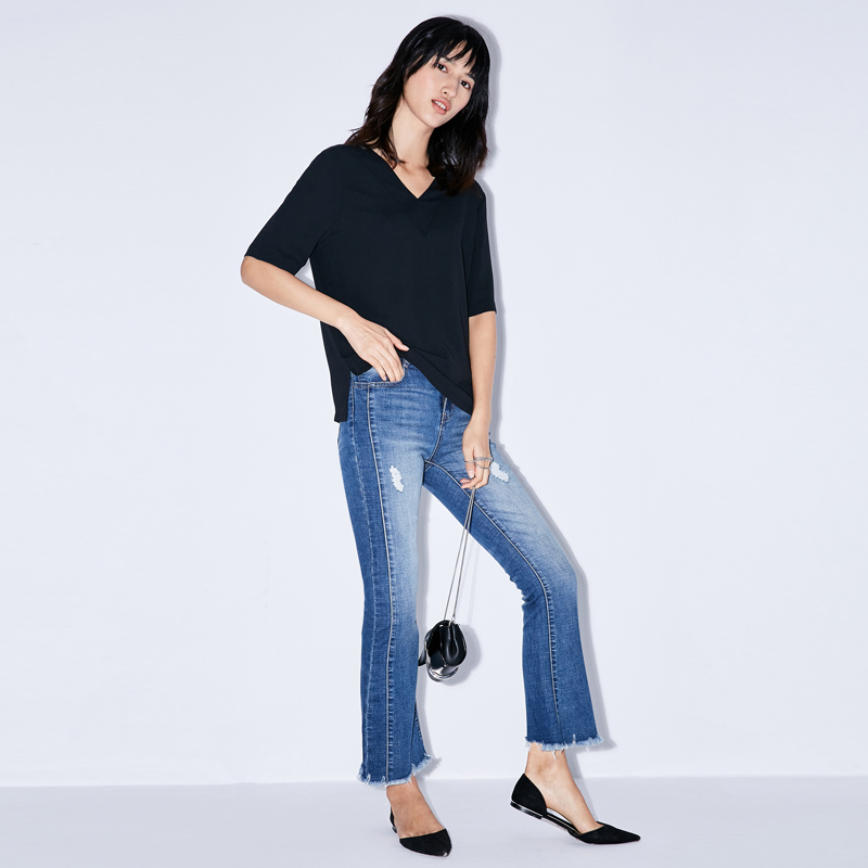 深V领微露锁骨,也是显瘦脸型的V领,优雅不失女人味,展现出女性柔美的一面,简洁而富有时尚气息。