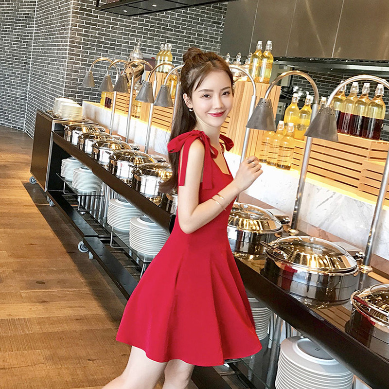 2017新款韩版蝴蝶结礼服女夏季性感露肩吊带红色连衣裙高腰A字裙
