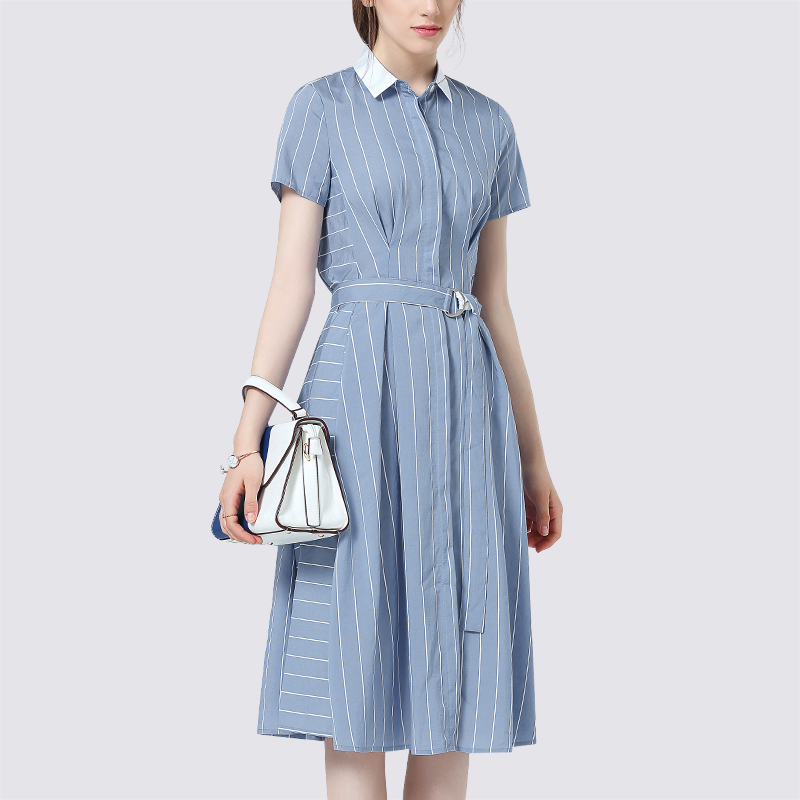 MeetMetro小清新条纹连衣裙女夏季2017新款气质显瘦衬衫裙中长款