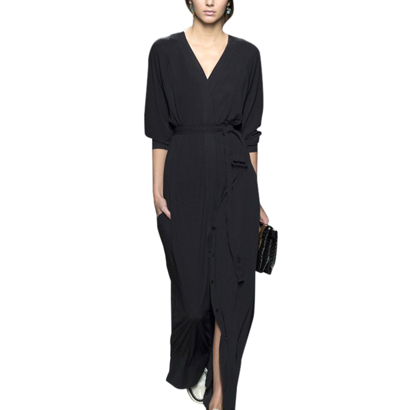 MeetMetro欧美2017秋装新款V领宽松大摆开叉雪纺连衣裙春秋长裙