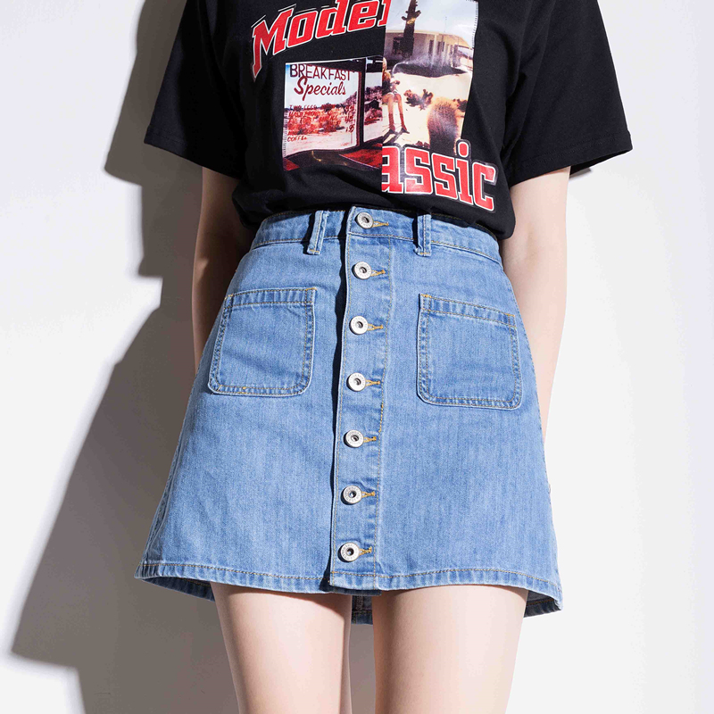 唐狮夏季牛仔裙女高腰A字裙韩版牛仔短裙显瘦牛仔裙单排扣半身裙