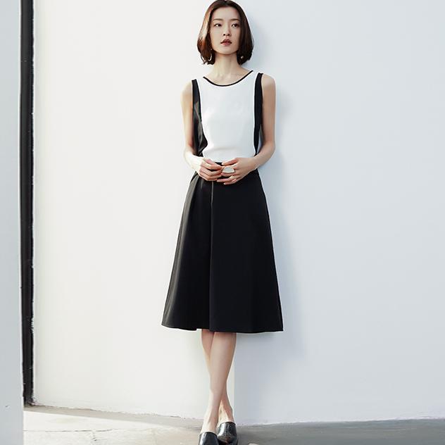 对白气质修身无袖连衣裙女 2017夏装新款 简约纯色高腰圆领中裙子