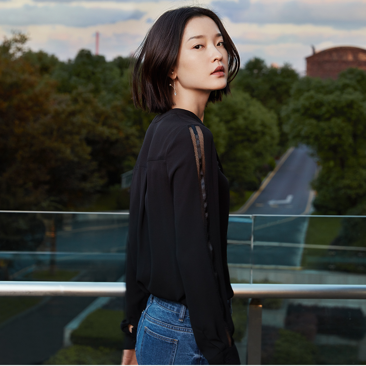 【杜鹃同款】对白简约V领雪纺衫女长袖秋装打底衬衫2017新款