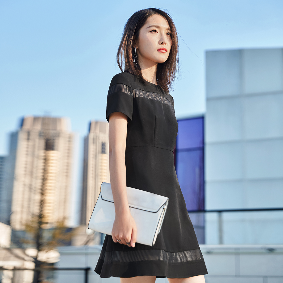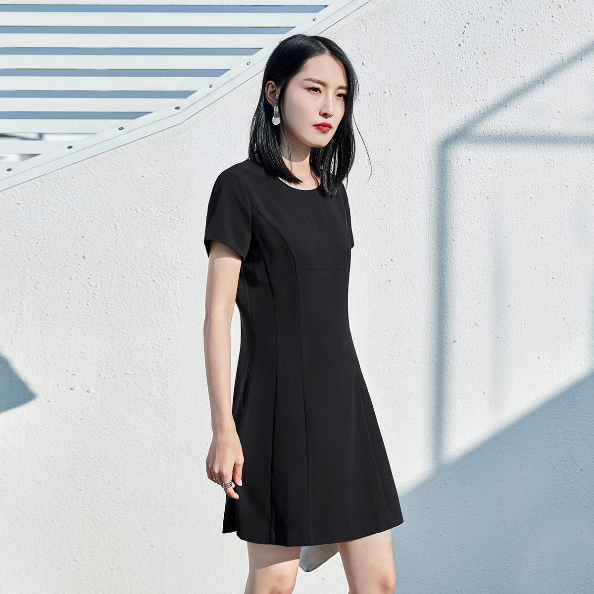 【杜鹃同款】对白修身短袖连衣裙女 2017夏装新款 圆领纯色小黑裙