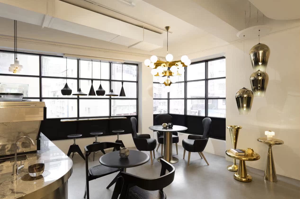 而一楼则设置为咖啡室,并由 Nodi 营运,提供一系列手工咖啡及小食,是小憩的最佳之地。周围则以 Tom Dixon 所设计的产品布置,让游人可以一边欣赏他设计的家品同时一边品尝咖啡。