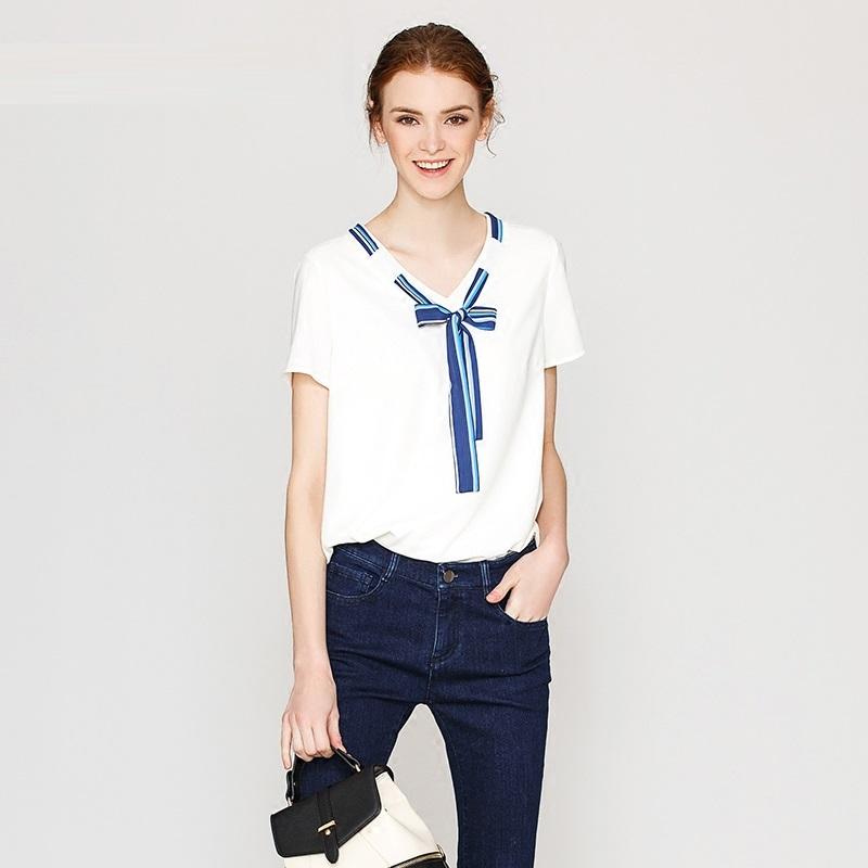 YINER音儿 V领蝴蝶结修身百搭T恤
