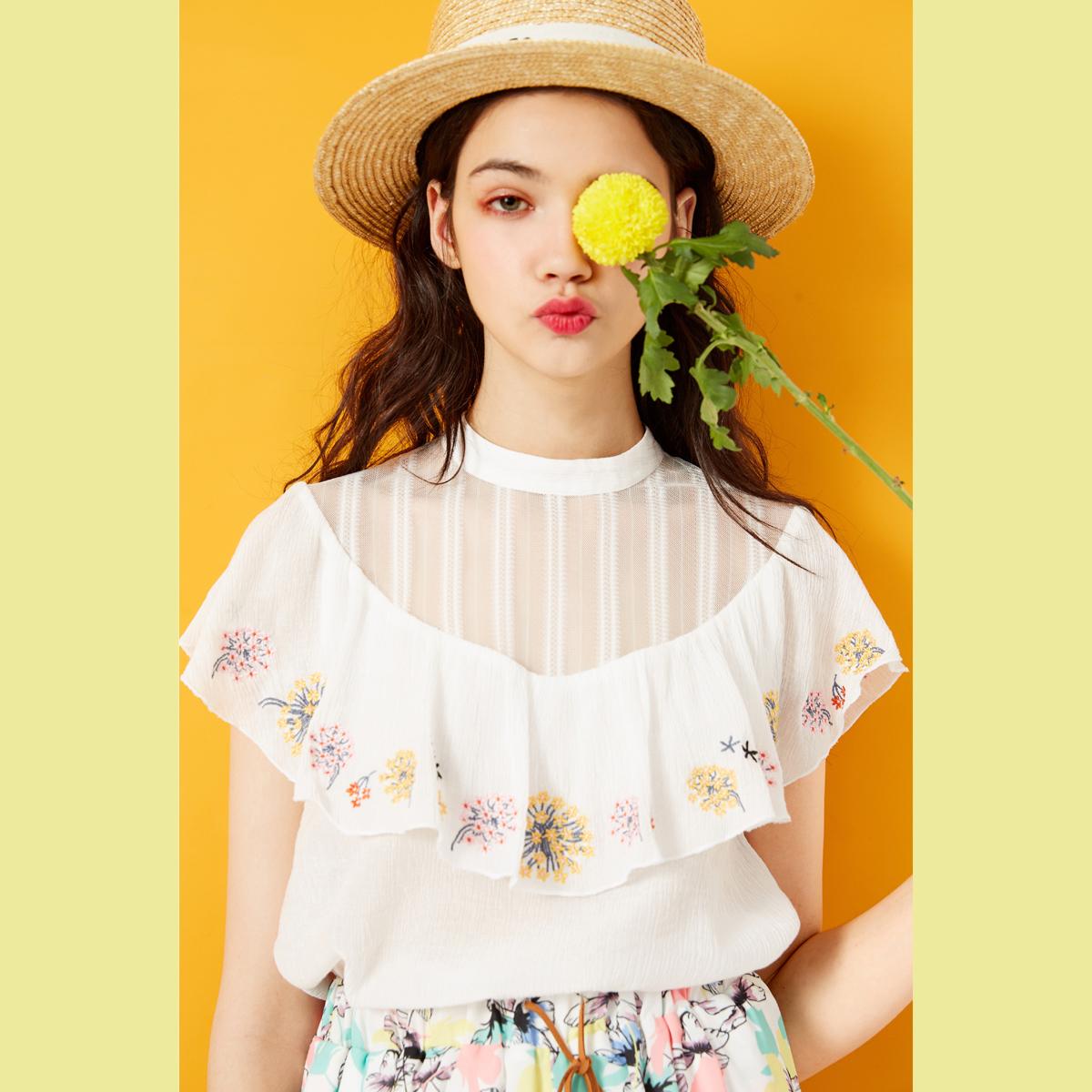 除了露肩设计,荷叶边还有很多用武之地,比如乐町这款上衣,在锁骨位置采用蕾丝透视设计,带一点点小性感的格调,配上碎花点缀的荷叶边,尽显俏皮减龄之感。