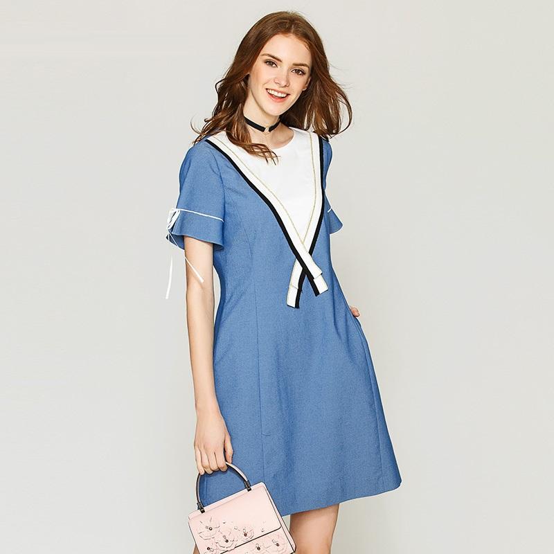 YINER音儿 V领拼接蝴蝶结连衣裙
