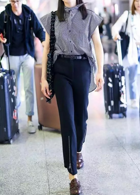 格子衬衫下配拉链开衩裤,脚踩漆皮压纹乐福鞋。别致的衬衫设计,丝毫没有一般短袖衬衫的平淡无趣。细格纹衬衫得要是胳膊细长的女孩穿才最合宜。