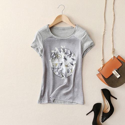 这款短袖有着一股清新淡雅的味道,淡蓝色的印花分散地布局在衣身前,如同一束百合花,清新脱俗。经典的圆领设计利落不失优雅,更能衬托出女性的柔美气息。简单的款式没有任何多余的点缀,举止间流露出女性的高贵典雅。