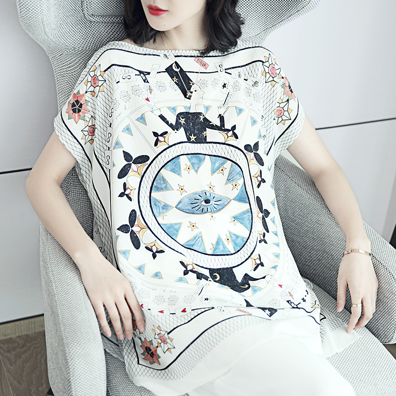 这款短袖的印花别具一格,充满了理性,有一种让人顿时冷静下来的功能。别致的一字领剪裁,露出肩部线条和漂亮的锁骨,充满女人味。衣衣下摆两侧分叉设计,减轻了对身体的约束,且配合衣衣款式,大气典雅。