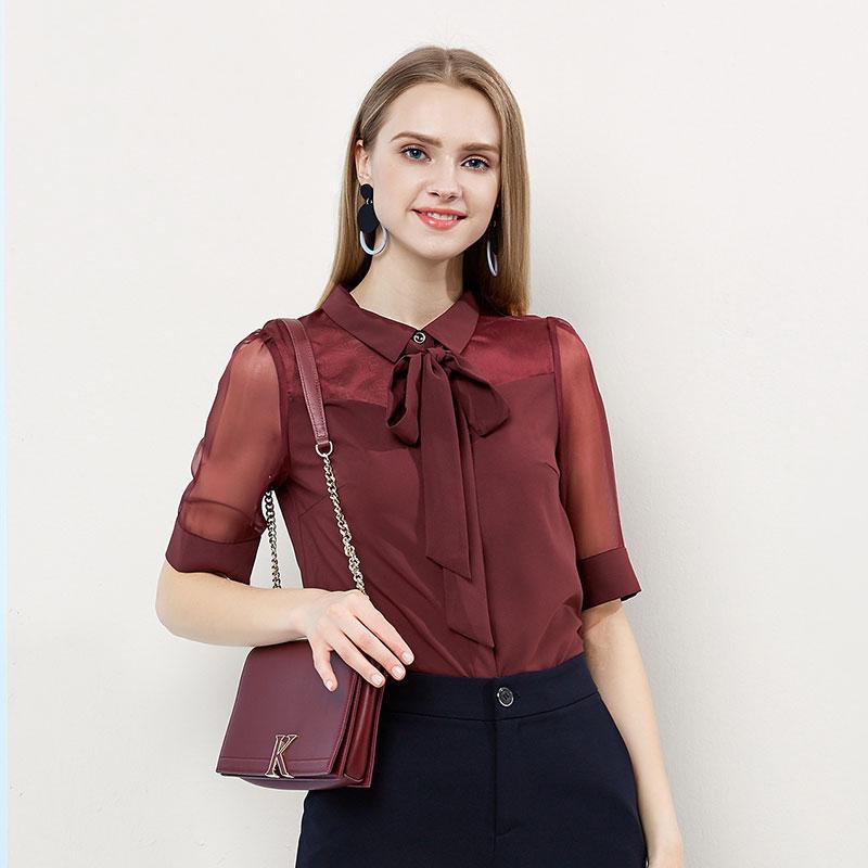 可拆卸系带的小尖领,凸显个性女人味,轻盈的触感展现女性的柔美,透视欧根纱的袖的设计更显清爽修饰手臂,搭配一款印花半身裙,浪漫精致,还能衬托曼妙身材。
