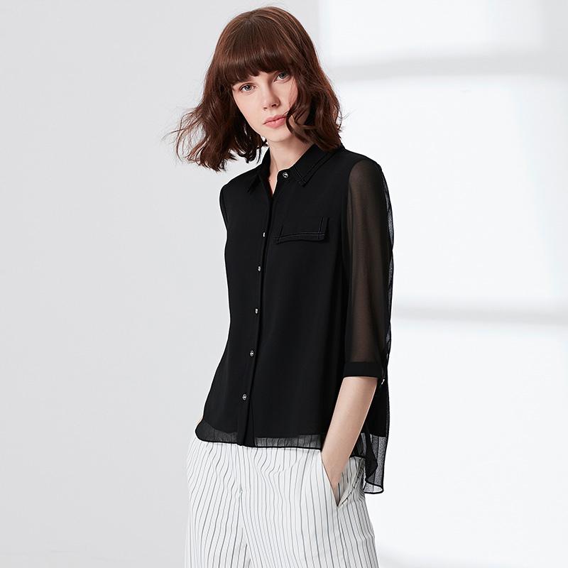 飘逸优雅的雪纺衫最适合在这个夏季穿了,精致的小翻领,黑色的色系,衬托出女性的知性干练气质,在搭配上一件高腰设计的半身裙,凸显你性感的身材。